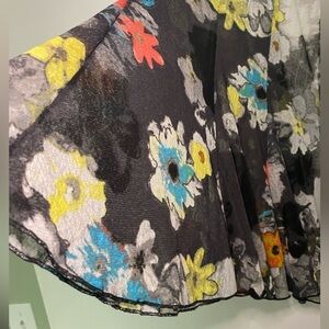 Such a pretty cardigan. It is a sheer floral pattern. Perfect for fall over a sweater, or a tank top in warmer weather. It can be dressy or casual! Long sleeves are sheer also. The lower part have a couple of insets making it fuller at the bottom and it flows beautifully.