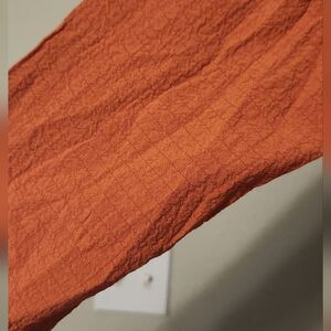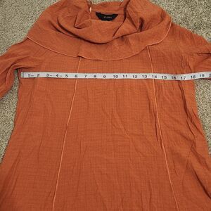 sz small cowl neck tunic with 3/4 sleeves. the color is a peachy orange. measurements are approximate taken laying flat pit to pit 18"