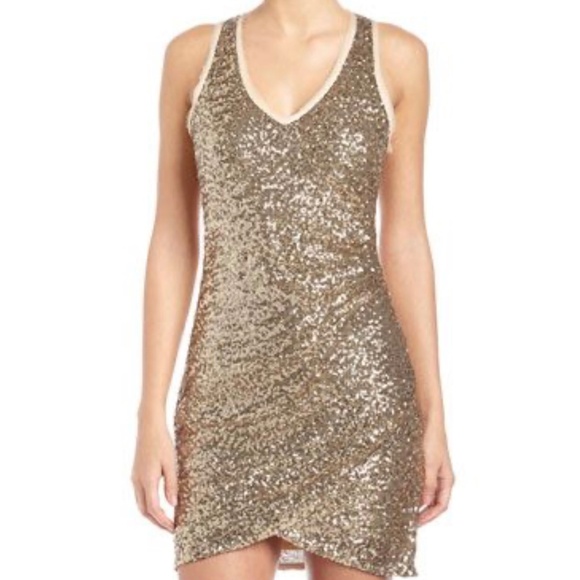 Turn heads in this stunning Ali Ro gold sequin mini dress in a size Medium.