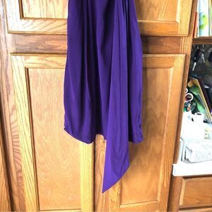 This Ali Ro mini dress in size 6 features a vibrant purple color and a stylish draped cowl neck with flutter sleeves in a silk blend material. The dress has a waist tie for a flattering fit and a zip closure for easy wearing. Perfect for various occasions such as travel, parties, or casual outings, this designer piece is lined, lightweight, and exudes a colorful and classic style suitable for the summer, fall, or spring seasons. The dress is accented with ruffles and a zipper, adding a touch of sophistication to its overall look.