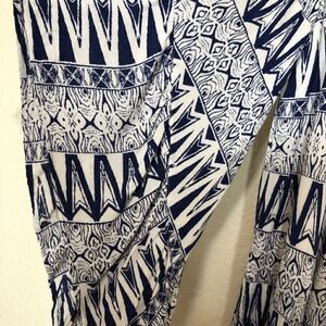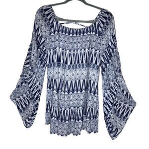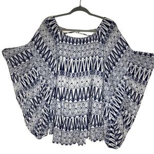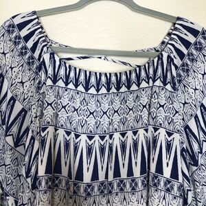 Beautiful, flowing top in a fresh blue and white Ikat design. Flattering A line shape. In excellent condition.