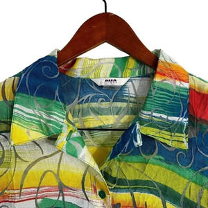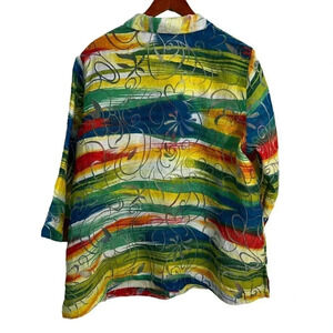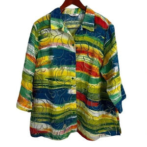 Add a pop of color to your wardrobe with this Alia tropical blouse. Featuring a bright colorful striped pattern with swirls, collared neckline, and button closure, this blouse is perfect for any occasion, whether it's a casual day out or a party. The 3/4 sleeves and lightweight, sheer material make it ideal for spring and summer. This blouse is made of a comfortable blend of polyester and viscose and is machine-washable for easy care. It's a regular fit with a casual sleeve type and comes in a plus size 20W. The unlined blouse is perfect for layering or wearing on its own. Don't miss out on this colorful addition to your wardrobe!