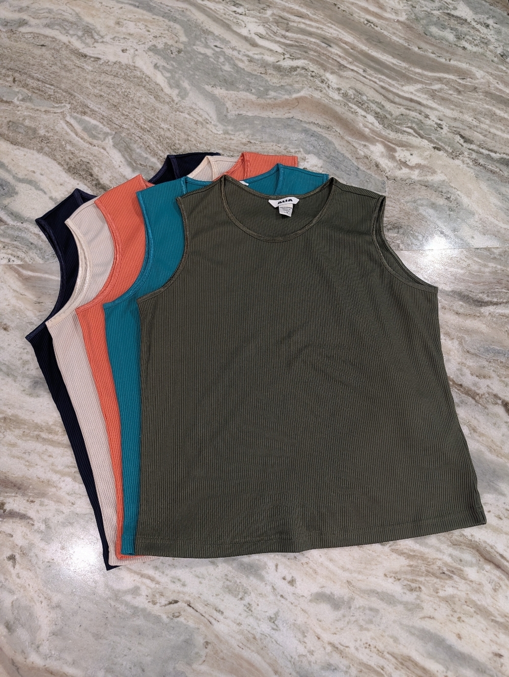 Soft ribbed knit tank with a scoop neckline. Fitted silhouette that layers easily. Smooth fabric with subtle stretch. Versatile for casual or dressed-up looks.