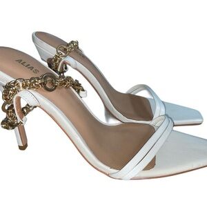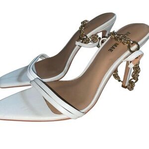 Elegant white heels with stylish gold chain detail. Perfect for any occasion.