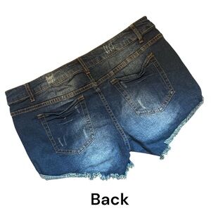 Distressed 5-pocket denim cut off shorts with fun appliqué embroidery. Juniors sizing. Cotton/spandex blend for a nice stretch. New boutique overstock.