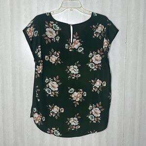 Chic floral blouse by Alice Blue. Features a green base with cream floral pattern. Short sleeves and V-neck design.