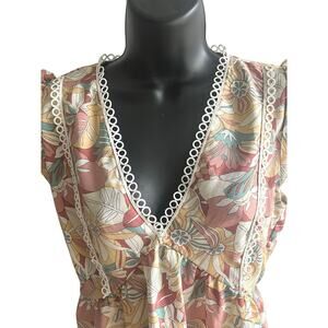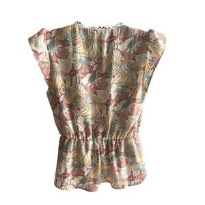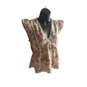 Add a burst of floral charm to your wardrobe with this Alice Blue women’s peplum top in size Small. Features a flattering deep V-neckline trimmed with eyelet lace, playful flutter sleeves, and a gathered waist for a feminine silhouette. The allover pastel floral pattern in warm earth tones makes it perfect for spring, summer, or festival wear.