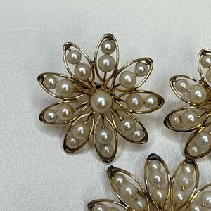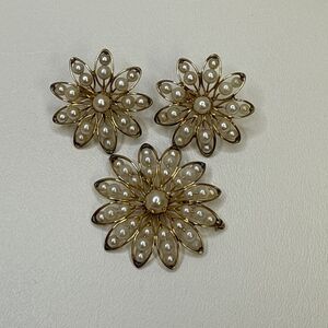 Alice Caviness Faux Pearls Abstract Flower Gold Filled Brooch & Clip Earrings