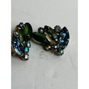 These vintage clip-on earrings are a striking blend of mid-century elegance and vibrant design. Featuring shimmering green and blue rhinestones, the intricate arrangement mimics floral and leaf motifs, making them a standout accessory. The gold-tone base adds a rich, timeless appeal, suitable for adding vintage charm to your ensemble.