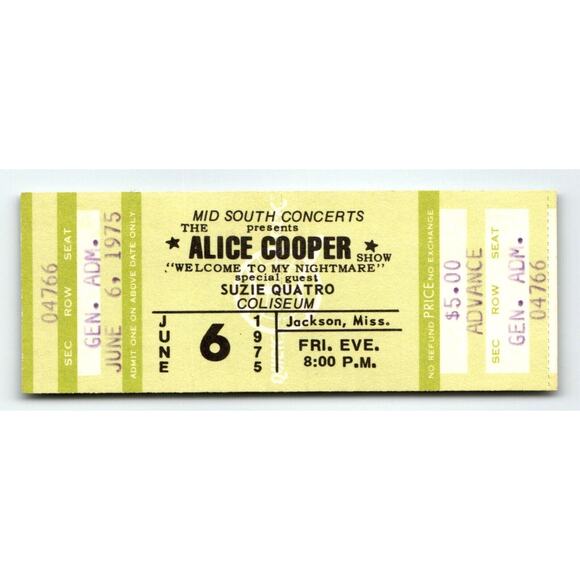 This is an original and unused 1975 concert ticket for Alice Cooper's "Welcome To My Nightmare" tour. The ticket is from a show in Jackson, Mississippi, United States. Alice Cooper is a rock and pop artist known for his theatrical performances. This memorabilia piece is a collector's item for fans of Alice Cooper and rock music.
