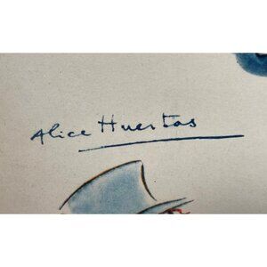 This beautiful vintage print (?) I am uncertain if this is a print or original. I can not find an identical item anywhere but I would have to take the frame apart to know for sure. by Alice Huertas captures the essence of French can-can dancing culture. The medium-sized gold framed, green velvet matted print measures 11 inches in length and 13 inches in height, making it a perfect addition to any retro or pinup girl themed collection.