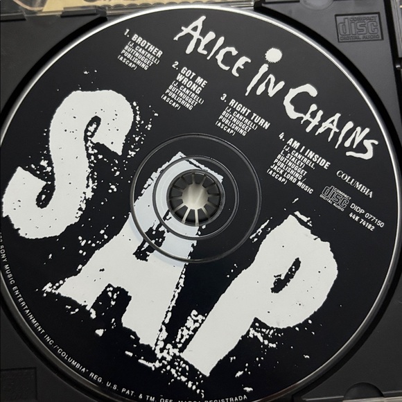 Alice In Chains SAP CD with striking black background and cream tub illustration. Bold band name and title visible on cover. Great for collectors and fans.