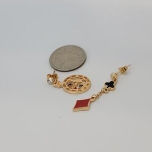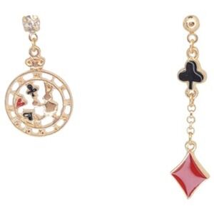 NEW! Fantastic Drop Dangle Gold Tone Enamel and 1 white round crystal earring. Playing card design. With the white rabbit and clock, mismatched shapes and length. Whimsical design. Great for cosplay or any occasion where fun is around.