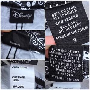 Stretch cotton fabric in a black & white Alice in Wonderland Print: Alice, Cheshire Cat, teapots, rabbit, roses, vines, hearts, locks, keys. 2 front pockets, 2 rear pockets, 4 buttons & small zipper closure. Very good preowned condition, overall. Size 3 by Disney.