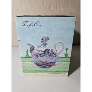 This is a "Tea for One" ceramic tea set featuring designs by Paul Cardew based on the Mad Hatter's tea party scene from Alice in Wonderland. The set includes a teapot with a lid and a cup that stacks underneath it.