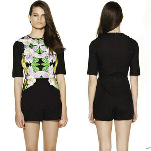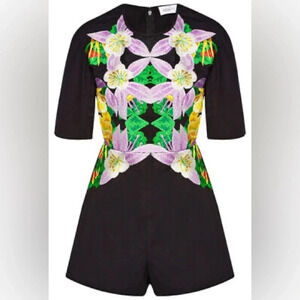 Cotton poplin playsuit with floral embroidery detail and mid-length sleeve.