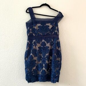 Description: stunning cocktail dress in a gorgeous blue with a one-side off the shoulder. Sheer underlay