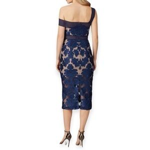 Description: stunning cocktail dress in a gorgeous blue with a one-side off the shoulder. Sheer underlay