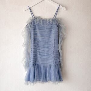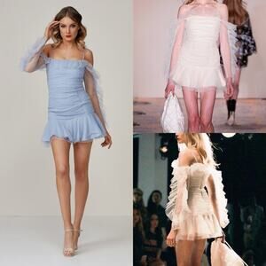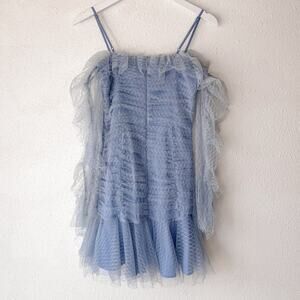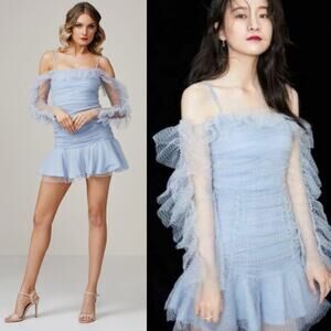 Flirty mini dress with delicate mesh fabric. Ruching across the bodice allows for a flattering fit. Sheer ruffle long sleeves makes for the perfect party dress.