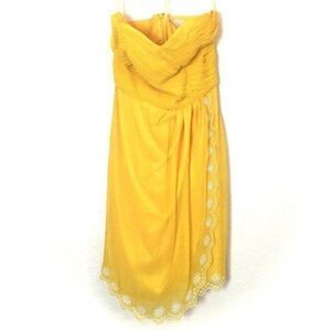 Yellow, strapless, silk Alice McCall dress. Box pleats at the bust, embroidered floral trim, and concealed zipper back closure. Fabric is 100% Silk; Lining is 97% Polyester & 3% Spandex. No visible signs of wear. Women's size medium M or US 8. Measurements: Bust: 33" Waist: 26" Hip: 40" Length: 30.5"