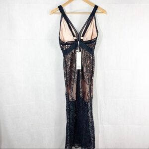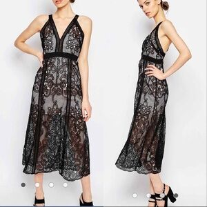 Alice McCall Wanderlust Black lace sleeveless midi dress in size US4. New with tags, no flaws. This stunning dress is crafted out of black floral and leaf guipure lace that veils the body beautifully with a plunging V neckline and cinched waist, this midi length style is super feminine and flattering. The nude lining highlights the gorgeous pattern that frames and slims the figure. This dress features beautiful and intricate lace pattern with eyelet trim, adjustable straps, sleeveless with V neck, concealed back zip. Measurements are approximates only. Waist 25” hip 33” length 48” bust 28”