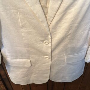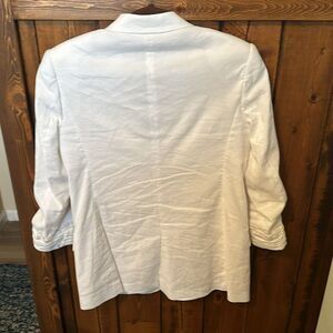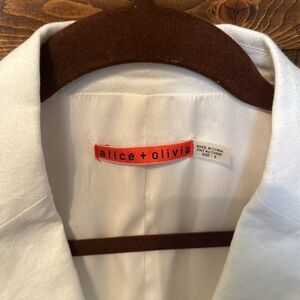 Alice + Olivia White Linen Blend Blazer. In great condition. Classic white linen blend blazer from Alice + Olivia. 3/4 length sleeve. Two button closure. Padded shoulders. Silk lined. Beautiful quality. -Color: White -Style: C000278540 -48% linen, 50% cotton, 2% Lycra