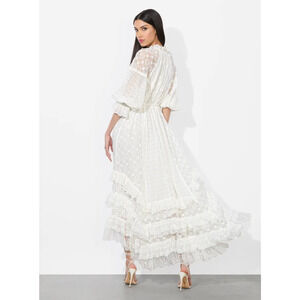 Romantic and ethereal, this lace maxi dress is a vision of bohemian elegance. Crafted from delicate eyelet lace, the flowing silhouette drapes effortlessly, creating a dreamy, boho aesthetic. The high neckline, adorned with soft ruffles, adds a touch of Victorian charm, while the voluminous sleeves with gathered cuffs enhance its hippie vibe. The tiered hem, featuring cascading layers, adds depth and movement to the design. Perfect for special occasions.