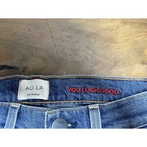 The Alice Olivia AO.LA Jeans in size 26 are a stylish pair of blue denim jeans with a split ankle design. Made with a medium wash denim fabric, these regular fit jeans feature a mid-rise waist and a 28-inch inseam. The jeans are accented with button detailing and have a solid pattern. They are machine washable and come with distressed features, stretch for comfort, and pockets for convenience. Designed by the brand Alice + Olivia, these jeans are perfect for women looking for a fashionable and versatile addition to their wardrobe.pre owned good condition we ship fast measurements are in the pictures