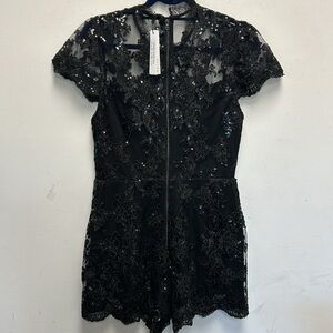 Alice + Olivia’s Alaina romper sparkles with shimmering sequins. This glamorous piece is styled with delicate lace trim, a round neck, and short sleeves.