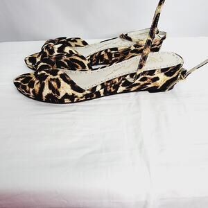 Alice + Olivia Alexi Sandal Women's Size 10 Leopard Print Open Toe Bow design on the front 2 " Wedge heel buckle ankle wrap Pre Owned Condtion. See the picture the elastic on the buckle is stretched some. There is a light brown mark on the sole and inner lining. Otherwise, the shoes are in great condition.