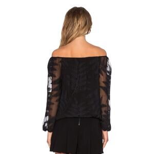 Alice + Olivia Alta Black Silk Embroidered Tropical Leaf Print Off Shoulder Top