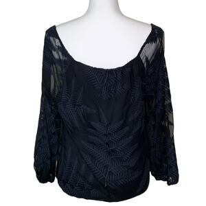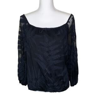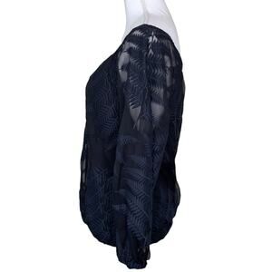 Alice + Olivia Alta Black Silk Embroidered Tropical Leaf Print Off Shoulder Top. Features elastic neckline hem, can be worn off-shoulder or as a boat neck, all-over embroidered leaf pattern, lined body. All photos except for modeled shots are of the actual item. Size S. Excellent condition. 100% silk. Measurements (approximate): PTP 19", length 17.5", sleeve length 21.5". This style originally retailed for $347 and is no longer available. Tags: designer, Alice & Olivia, Alice and Olivia, modern basics, casual chic, elevated wardrobe, minimal style, blouse, versatile top, relaxed fit, luxe fabric, easy to style, everyday staple, high end fashion, statement piece, work to evening, trend forward, street style friendly.