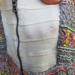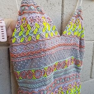Great pre-owned condition with flaw* back non beaded elastic section has some defects/thinning as shown. Additional strap intended for hanging is missing on left side. Stain on brand tag
