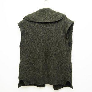 A very versatile piece with its earthy army green color and flattering oversized open vest style, this Alice + Olivia piece is the perfect knitwear to have in your closet for years to come. The large collar folds add playfulness to an otherwise straightforward wear. It has 2 functional pockets in the front. It has a faint cable knit design all over. Made with mixed materials including wool to keep you warm and cozy. In great used condition. No known rips, tears or stains.