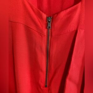 Alice + Olivia party dress in a deep coral / orange red “Bright Poppy” fitted sheath style with darts at bust and down waist line. Asymmetrical tiered side ruffle with a cutout open back and exposed zipper. Snaps at top, fully lined in silk. Perfect party or summer wedding guest attire! One small area on back side of waist has come unstitched. Inner stitching is still in tact so there is no opening. Size tag and fabric content has been removed so please refer to measurements, but this fits like a size 0/2