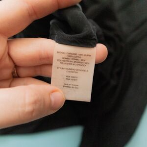 Features: Dark gray/washed black 3/4 sleeve button front top with fitted blouson style stretch attached skirt.