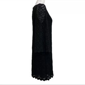 Beautiful, classic little black dress, perfect for cocktail parties or a nice night out. Floral detail lace overlay with a wide neckline and flared long sleeves. Scalloped hem. Fully lined, zip back closure.