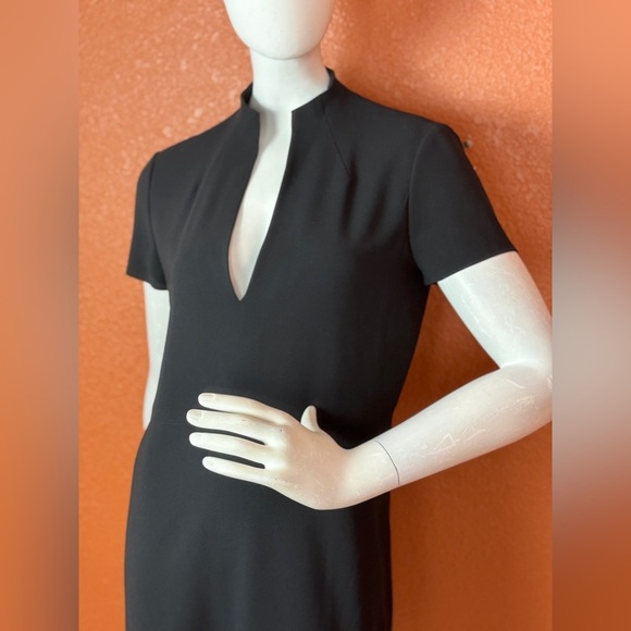 Chic black mini dress with a deep V-neck. Short sleeves and sleek silhouette. Perfect for stylish outings dress in good condition