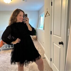 Alice + Olivia Black Silk Button Front Tulle Long Sleeve Mini Dress Small