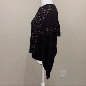 Elegant black sweater with intricate beaded design. Features a crew neck and layered sleeves. Ideal for a sophisticated look.