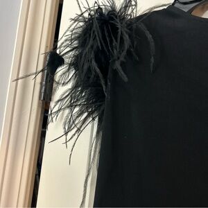 Chic black blouse with dramatic feather accents. Ideal for evening wear.
