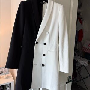 Chic mini dress with a bold black and white design. Features a double-breasted front. Perfect for a stylish statement.