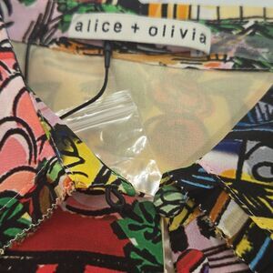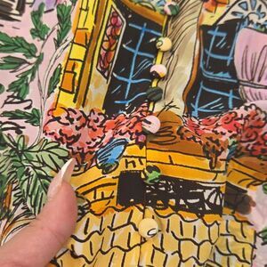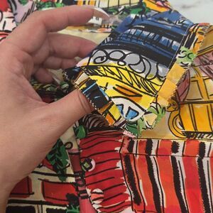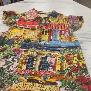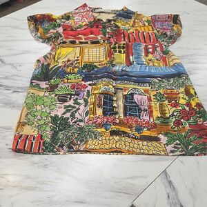 Vibrant blouse with a colorful graphic print. Features a mix of red, yellow, blue, and green hues.