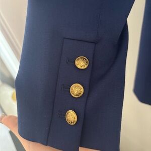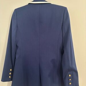 Chic blue blazer with striking white accents. Features gold buttons. Ideal for versatile styling.