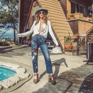 Stylish blue jeans with intricate embroidery. Features floral and artistic designs. Perfect for a chic look.