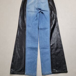 Stylish flare jeans with a unique design. Blue denim with black side panels. Perfect for a chic look.