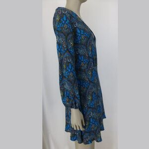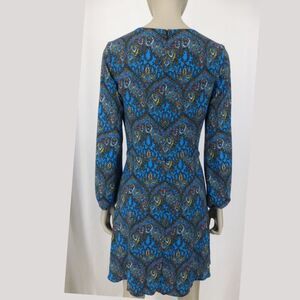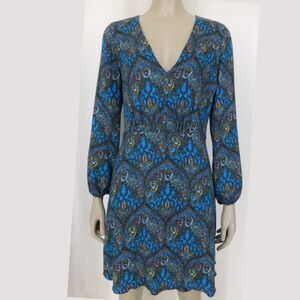 Stylish mini dress with a vibrant blue and gray pattern. Features long sleeves and a flattering V-neckline. Perfect for any occasion.