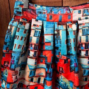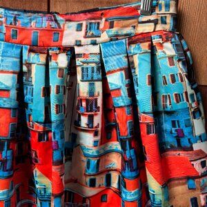 Elevate your wardrobe with this vibrant Alice + Olivia pleated mini skirt in size 8 - She is gorgeous! Featuring a bold multicolor abstract cityscape print with butterfly accents, (mainly blue with red/orange) this skirt is a true statement piece. Crafted from high-quality fabric with a flattering A-line silhouette, it’s perfect for pairing with a crisp blouse, graphic tee, or fitted tank.