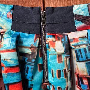 Alice + Olivia skirt, designer mini skirt, abstract print skirt, colorful A-line skirt, pleated cityscape skirt, Alice + Olivia size 2, vacation skirt, summer statement skirt, butterfly print skirt