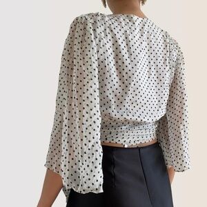 Crepe fabric, wide bell sleeves, textured velvet polka-dot black & white print, cropped profile V neck, long sleeves, tie at waist. Perfect for work with a high waisted skirt or as a going out top.
